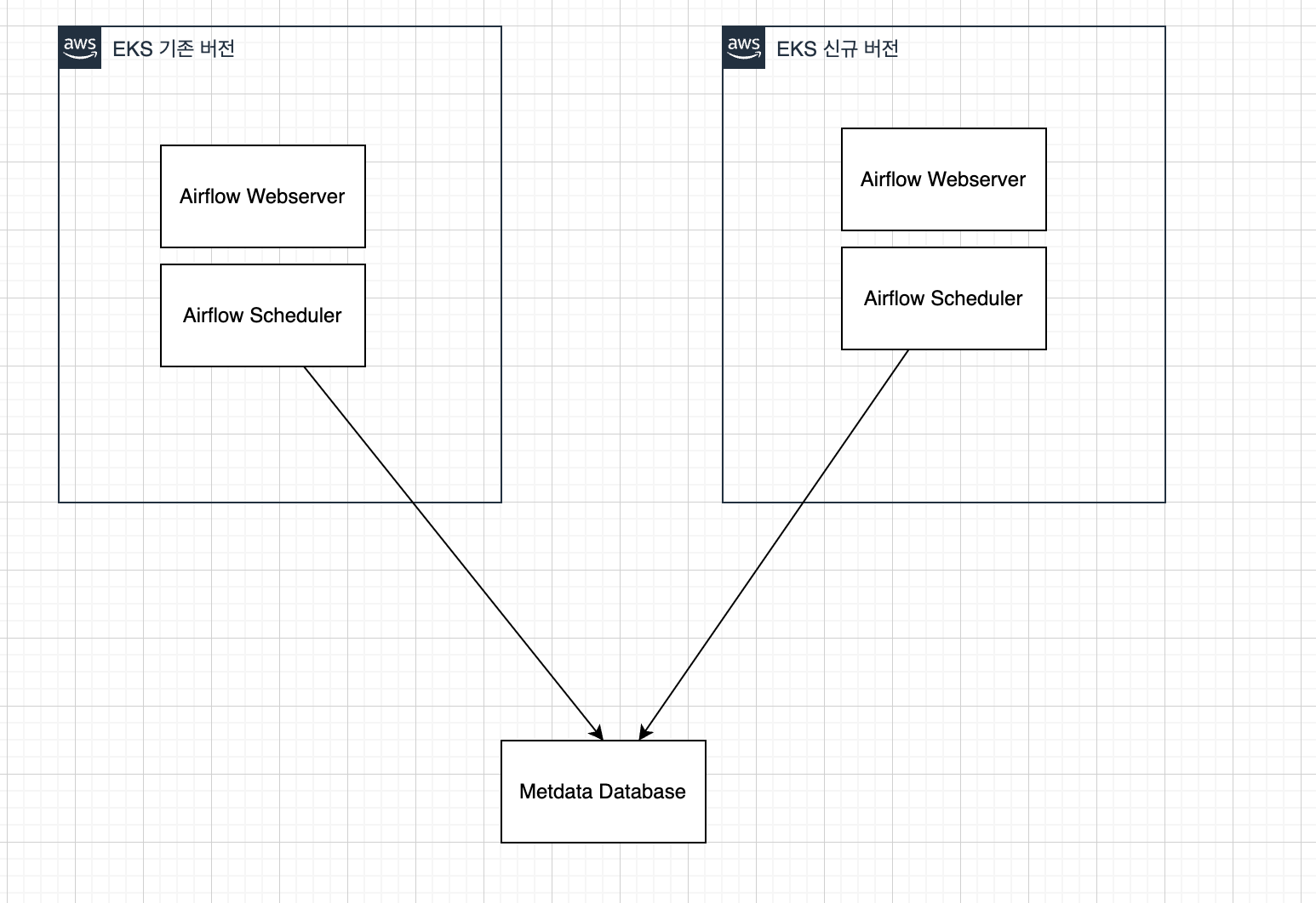따라서, 기존 버전의 EKS 와, 신규 버전의 EKS 양쪽에 동일한 Airflow 구성 (Metadata database 포함)을 하고, 점진적으로 기존 버전 EKS의 Airflow 에는 executor 에 작업을 submit 하지 않도록 하면서, 신규 버전 EKS 의 Airflow 에는 executor 에 작업을 submit 하도록 하는 형태로 작업하면 될 것이라고 구상했다.